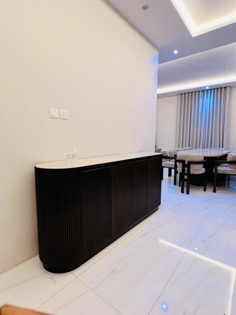 بوفيه مودرن بتصميم مضلع وسطح رخامي – فخامة اللون الأسود لغرفة الطعام