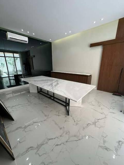 - السطح: مصنوع من الرخام الأبيض الطبيعي مع عروق رمادية واضحة، مما يمنح الطاولة مظهراً فخماً وراقياً.